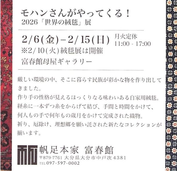 トップ > おしらせ | その他 | ブログ | 展覧会 | 絨毯紹介 > 2026/2/6(金)-2/15(日) モハンがやってくる!  世界の絨毯展 2026 in 大分 帆足本家 富春館