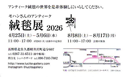 トップ > おしらせ | その他 | ブログ | 展覧会 > 2026/4/25(土) -5/6(水) モハンのアンティーク絨毯展 in 軽井沢 追分 ルーサイトギャラリー